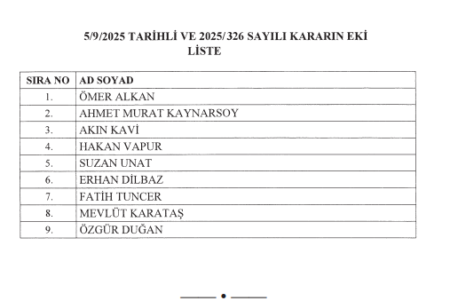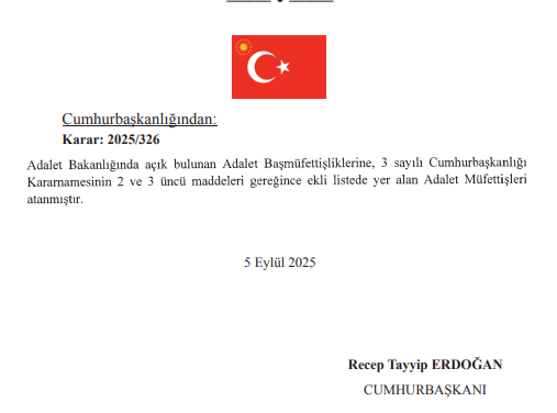 Adalet Müfettişleri Ömer ALKAN, Ahmet Murat KAYNARSOY, Akın KAVİ, Hakan VAPUR, Suzan UNAT, Erhan DİLBAZ, Fatih TUNCER, Mevlüt KARATAŞ ve Özgür DUĞAN 05/09/2025 tarihli ve 2025/326 karar sayılı Cumhurbaşkanlığı Kararnamesi ile Adalet Başmüfettişliklerine atanmıştır.
